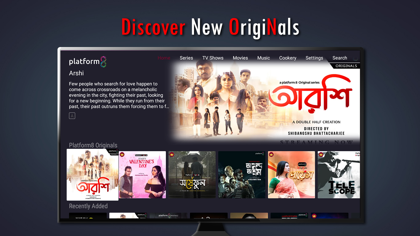 แพลตฟอร์มการสตรีมวิดีโอตามความต้องการสำหรับผู้ชมทั่วโลก โมเดลตามการสมัครรับข้อมูลฟรีเมียมที่มีเนื้อหาวิดีโอเพื่อความบันเทิงมากกว่า 400 ชั่วโมงที่เพิ่มเข้ามาในช่วงเวลาปกติ ผู้บุกเบิกการนำความบันเทิงสำหรับครอบครัวของชาวเบงกาลีมาสู่แพลตฟอร์ม OTT Platform 8 มาพร้อมกับตัวเลือกมากมาย ไม่ว่าจะเป็นหนังสั้น ซีรีส์ ละคร ระทึกขวัญ ภาพยนตร์คลาสสิก รายการเพลง และอีกมากมาย มาจากบ้านของ Aakash Aath และ Channel Eight ซึ่งได้รับความนิยมอย่างมากในหมู่ผู้ชมชาวเบงกาลีมานานหลายทศวรรษ