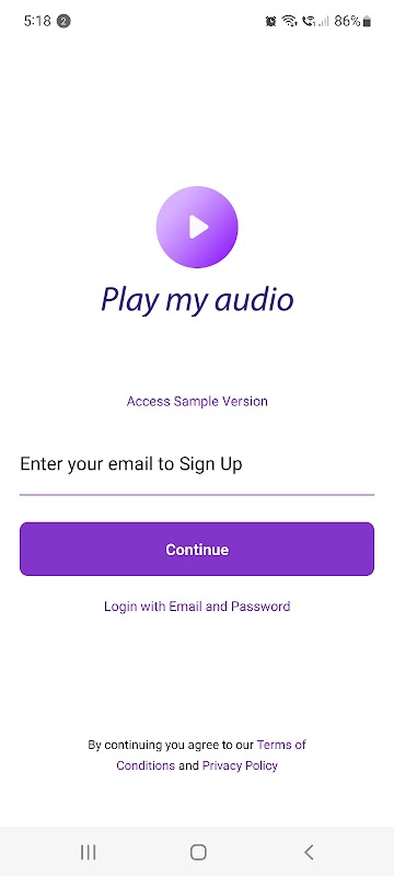 - เข้าสู่ระบบและเริ่มต้นบัญชีใหม่: ป้อนอีเมลของคุณเพื่อลงทะเบียน - ป้อนอีเมลของคุณ - เมื่อเสร็จแล้วให้แตะปุ่มดำเนินการต่อสีม่วง เข้าถึงที่อยู่อีเมลของคุณเพื่อรับรหัสผ่านหมายเลขที่ส่งโดย Play my audio จากนั้นป้อนลงในแอปพลิเคชัน Play my audio อาจใช้เวลาประมาณหนึ่งหรือสองนาทีในการรับ มีปุ่ม Retry เพื่อส่งอีกครั้ง ตรวจสอบอีกครั้งว่าที่อยู่อีเมลของคุณถูกต้อง และรีเฟรชอีเมลใหม่และอีเมลขยะ เมื่อรหัสผ่านได้รับการอนุมัติให้สร้างรหัสผ่านเพื่อเข้าสู่ระบบ Play my audio เพื่อเข้าถึงบัญชีของคุณ