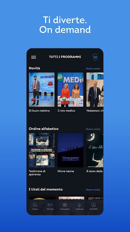 Play2000 แอพของ Tv2000 และ inBlu2000 เป็นแพลตฟอร์มสตรีมมิ่งที่สำรวจและให้ความบันเทิงด้วยการถ่ายทอดสด วิดีโอตามต้องการ และพอดแคสต์ ซึ่งเชื่อมต่อกับผู้ออกอากาศที่มีความรู้สึกเป็นชุมชนที่เข้มแข็ง