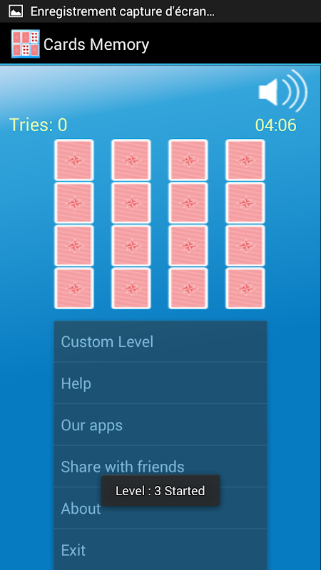 Objective of this game is to open all the hidden cards by flipping it. Just tap on a card to show the hidden object under it. Tap on another same card will keep it open. Otherwise cards will be hided again. Open all cards as fast as possible with less number of taps to set top score.