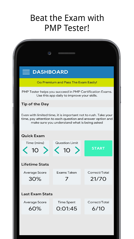 การสอบรับรอง PMP เป็นข้อสอบที่ค่อนข้างยาก คุณต้องฝึกฝนคำถามหลายร้อยข้อเพื่อที่จะผ่านมันไป นอกจากนี้การรับรอง PMP มีค่าใช้จ่ายประมาณ 405 USD สำหรับสมาชิกและ 555 USD สำหรับผู้ที่ไม่ได้เป็นสมาชิก เพื่อที่จะประสบความสำเร็จในความพยายามครั้งแรกของคุณคุณต้องตอบคำถามเกี่ยวกับการฝึกอบรมมากมาย แอป "PMP Test" มีคำถามหลายร้อยข้อ