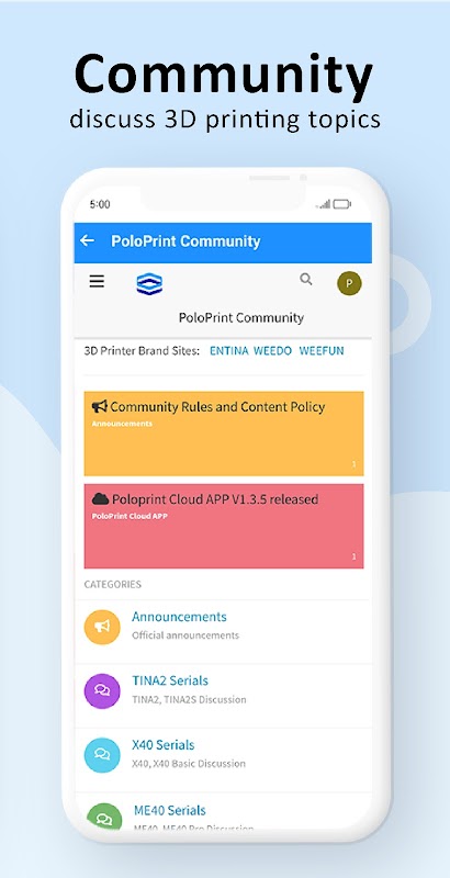 เครื่องพิมพ์ 3 มิติที่รองรับโดย Poloprint Cloud คือ Tina2S เฟิร์มแวร์มอเตอร์และเฟิร์มแวร์ WIFI ของ Tina2S จำเป็นต้องอัปเกรดเป็น V1.4 หรือสูงกว่า สำหรับเครื่องพิมพ์ที่สูงกว่า V1.3 สามารถใช้โหมดการควบคุมภายในเพื่อเชื่อมต่อเครื่องพิมพ์ใน APP จากนั้นใช้หน้าจอข้อมูลเฟิร์มแวร์เพื่ออัปเกรดเฟิร์มแวร์ออนไลน์ สำหรับเครื่องพิมพ์ที่ต่ำกว่า V1.3 คุณต้องอัปเดตเฟิร์มแวร์เป็นเวอร์ชันล่าสุดด้วยตนเอง โปรดติดต่อตัวแทนจำหน่ายของคุณสำหรับเฟิร์มแวร์และวิธีการอัปเกรดเฟิร์มแวร์ล่าสุด