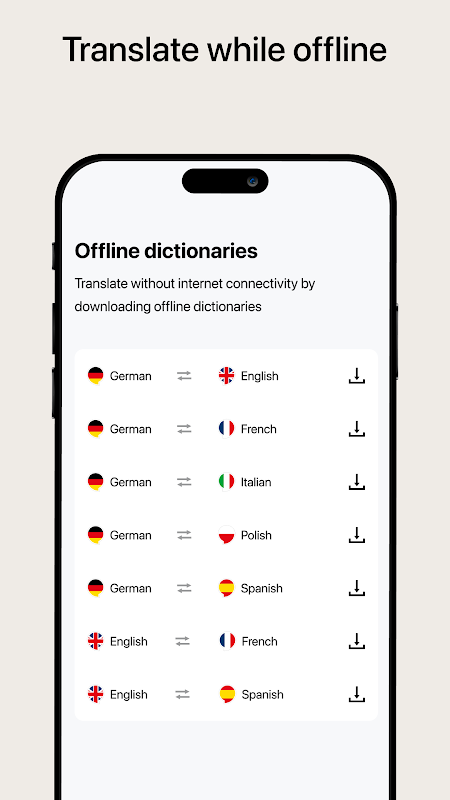ดาวน์โหลดพจนานุกรมที่เลือกและใช้แอปออฟไลน์และออนไลน์ คุณสามารถเลือกระยะเวลาการสมัครสมาชิกได้หลากหลาย* ผ่านการซื้อในแอป จากนั้นคุณจะได้รับพจนานุกรมที่คุณต้องการโดยไม่มีโฆษณา แม้ว่าคุณจะใช้พจนานุกรมออนไลน์ก็ตาม หากคุณสนใจการใช้งานแบบไม่มีโฆษณา แต่ไม่ต้องการดาวน์โหลดพจนานุกรม คุณสามารถสมัครสมาชิกเพิ่มเติมได้ โปรดทราบ: คุณสามารถใช้นักแปลออนไลน์ได้ตลอดเวลาและไม่มีค่าใช้จ่ายใดๆ ทั้งสิ้น แม้ว่าจะไม่ได้ซื้อในแอปก็ตาม