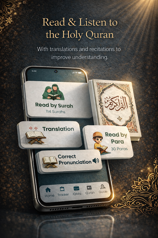 อ่านอัลกุรอานได้ทุกเวลาด้วยข้อความภาษาอาหรับที่ชัดเจนและการแปล ฟังการอ่านที่ไพเราะเพื่อปรับปรุงการออกเสียงและความเข้าใจ บทสวดขอพรประจำวัน อัซการ์ และหะดีษที่เชื่อถือได้รวมอยู่ด้วยเพื่อสนับสนุนกิจวัตรทางจิตวิญญาณของคุณนอกเหนือจากเวลาละหมาด