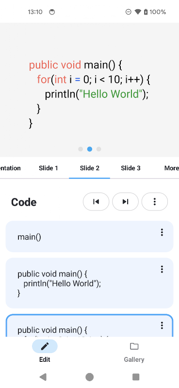 Presento ทำให้โค้ดของคุณเคลื่อนไหวโดยอัตโนมัติราวกับว่ากำลังเขียนแบบเรียลไทม์ในที่เกิดเหตุ รับชมโค้ดของคุณที่เปิดเผยแบบไดนามิก เพิ่มการมีส่วนร่วมอีกชั้นให้กับงานนำเสนอของคุณ