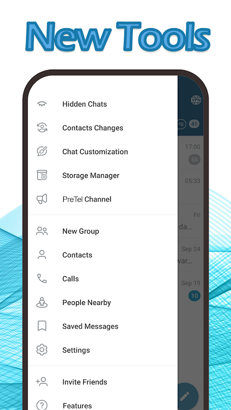 PreTel นำเสนอฟีเจอร์ที่มีประโยชน์มากขึ้นแก่ผู้ใช้ เช่น แชทที่ซ่อนอยู่ ตัวจัดการพื้นที่เก็บข้อมูล แบบอักษร ความสามารถในการดาวน์โหลด และระบบพร็อกซีอัจฉริยะเพื่อเชื่อมต่ออยู่เสมอแม้จะมีการเชื่อมต่ออินเทอร์เน็ตที่จำกัด ด้วย Pretel คุณสามารถส่งหรือรับไฟล์ APK จากเพื่อนของคุณและติดตั้งลงในอุปกรณ์ของคุณได้