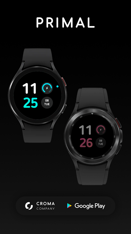 Primal เป็นหน้าปัดนาฬิกาสำหรับ Wear OS ที่มีแบบอักษรดิจิทัลขนาดใหญ่พร้อมธีมสีต่างๆ หกธีมที่สามารถเลือกได้จากการตั้งค่า ทางด้านขวาของหน้าปัดจะแสดงกราฟแบตเตอรี่และข้อมูลวันที่ มีโหมด 12 ชั่วโมงและ 24 ชั่วโมงและมีหลายภาษา