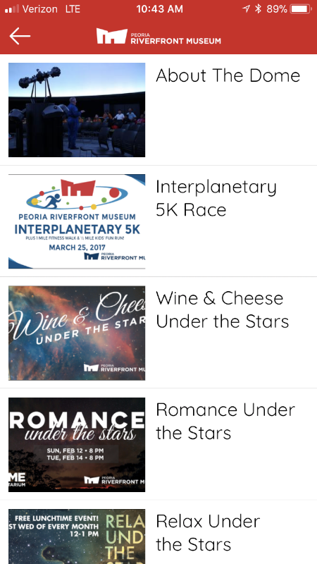 A new app for Peoria Riverfront Museum members and guests to enhance the museum experience. Features include events calendar, exhibits information, giant screen and planetarium information, enhanced multimedia information, quizzes, loyalty, coupons, and more. Upgrades include improvements to user experience, maps, loyalty program, coupons, event calendar, and more.