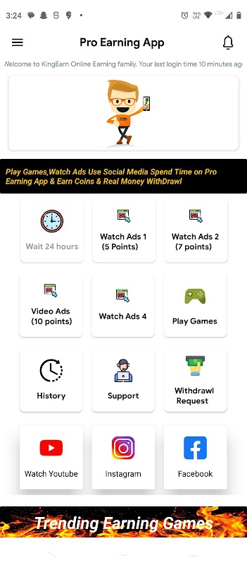 Pro Earning App is A Very Straight Forward Earning App Where Users Have No Loss . Just they have to play games for earning some pocket money in their spare time This App Also Provides Daily Bonus Points And Various Other Exciting Features To Boost Your Earnings