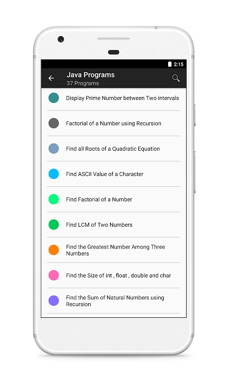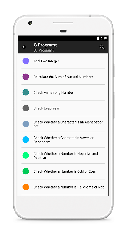 The app contains C, C++ basic programs which you may come across during your education time. It also contains java programs, System programming Programs, Assembly programs, Operating System programs, Artificial Intelligence - Prolog programs, Computer Graphics Programs and many more.