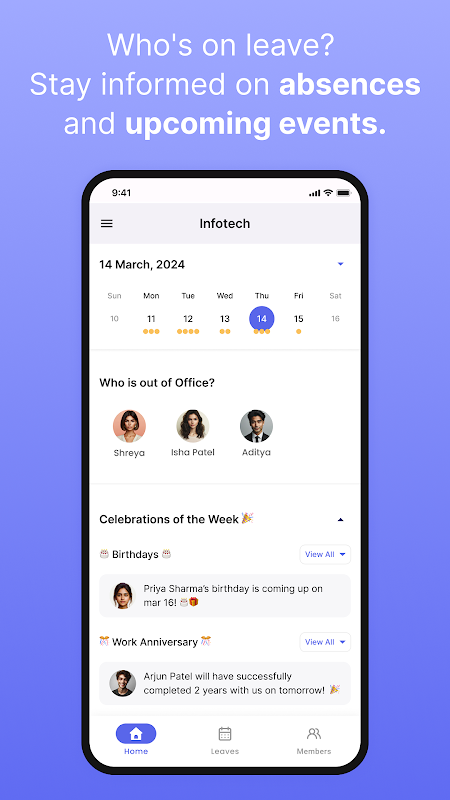 - การประสานงานของทีม: 👥: ปรับปรุงการประสานงานในทีมโดยอนุญาตให้ผู้ใช้ดูเพื่อนร่วมงานในช่วงลางาน ส่งเสริมสภาพแวดล้อมการทำงานที่ทำงานร่วมกันและมีข้อมูลครบถ้วน