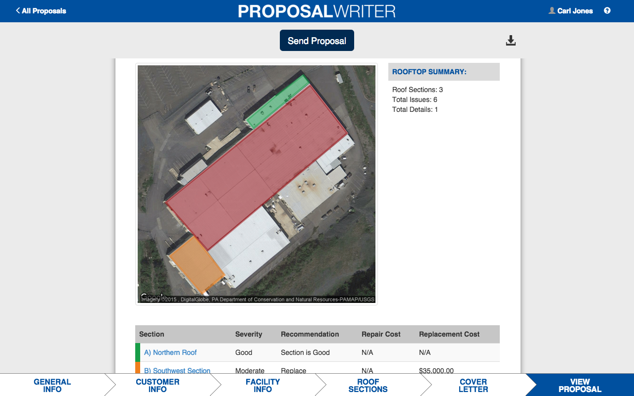 คาร์ไลล์นักเขียนข้อเสนอจะช่วยให้ตัวแทนขายและผู้รับเหมามุงหลังคาที่มีคุณสมบัติเหมาะสมที่จะดำเนินการตรวจสอบบนชั้นดาดฟ้าสำหรับงานมุงหลังคาที่อาจเกิดขึ้นก่อนที่จะมีการก่อสร้างหรือซ่อมแซม ตรวจสอบหลังคาสามารถสร้างภาพวาดที่เป็นที่ตั้งของพื้นที่ตรวจสอบหลังคา, แคตตาล็อกบนชั้นดาดฟ้าและสภาพปัญหาที่อาจเกิดบนหลังคา ซอฟแวร์แล้วสร้างรายงานสภาพหลังคาสำหรับเจ้าของอาคารผู้จัดการสิ่งอำนวยความสะดวกหรือลูกค้าที่มีศักยภาพ ด้วยการเขียนข้อเสนอการตรวจสอบหลังคาสามารถ: