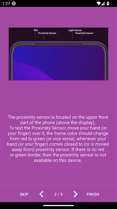 ในการทดสอบเซ็นเซอร์ความใกล้ชิดขยับมือของคุณ (หรือนิ้วของคุณ) เหนือกรอบสีควรเปลี่ยนจากสีแดงเป็นสีเขียว (หรือในทางกลับกัน) เมื่อใดก็ตามที่มือของคุณ (หรือนิ้วของคุณ) เข้าใกล้ เซ็นเซอร์ความใกล้ชิด หากไม่มีเส้นขอบสีแดงหรือสีเขียวแสดงว่าไม่มีเซ็นเซอร์ความใกล้ชิดในอุปกรณ์นี้