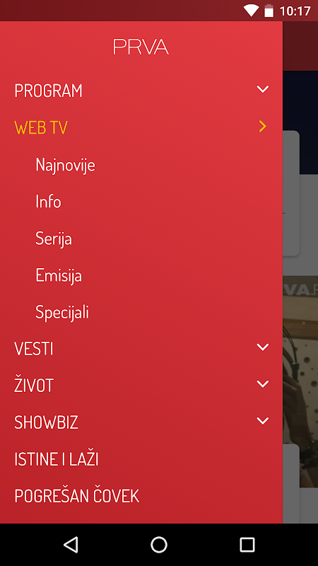 Posebna poslastica čeka vas u rubrici Web tv! Gledanje video sadržaja sada će biti pravo uživanje, jer ćete svoje omiljene serije i emisije brzo i lako pronaći gledati na vašem omiljenom uređaju. Vaši omiljeni formati i vesti dolaziće do vas i pre nego što ih potražite budući da aplikacija donosi i mogućnost notifikacija. Ne odustajemo ni od formata koji su specijalno kreirani za sajt Prva.rs i koje ekskluzivno možete gledati samo na našem portalu, u sekciji Web TV specijali.