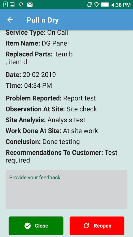 Service team of Pull 'n' Dry will be able to view the services assigned to them and will be able to provide a report post service.