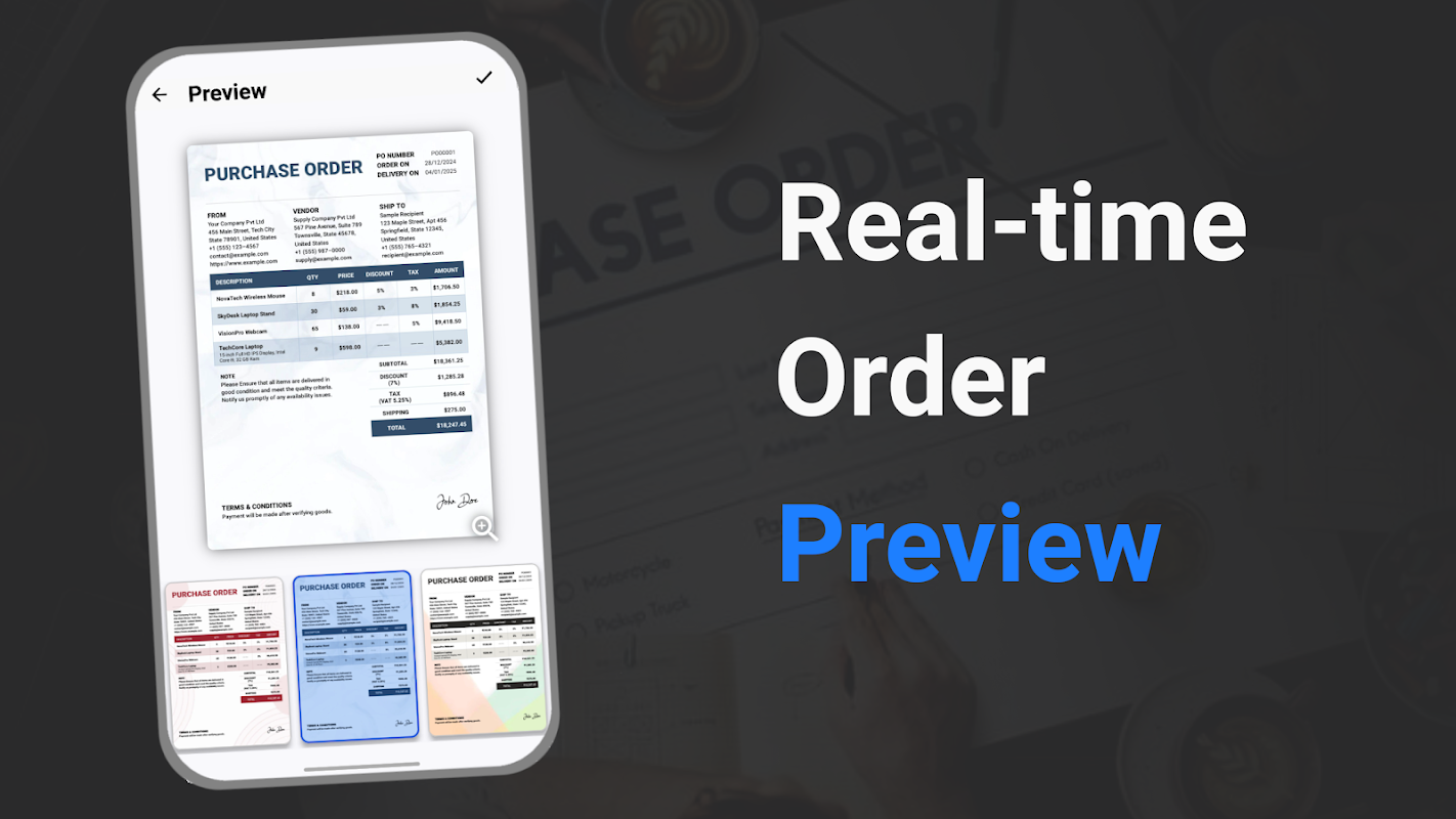 ด้วยเครื่องมือสร้างใบสั่งซื้อ - ง่ายและรวดเร็ว คุณสามารถสร้าง จัดการ ส่งและติดตามใบสั่งซื้อได้ทุกที่ จัดระเบียบทุกอย่างเพื่อให้มั่นใจว่ากระบวนการจัดซื้อของคุณดำเนินไปอย่างราบรื่นและมีประสิทธิภาพด้วยแอปใบสั่งซื้อที่ใช้งานง่ายนี้