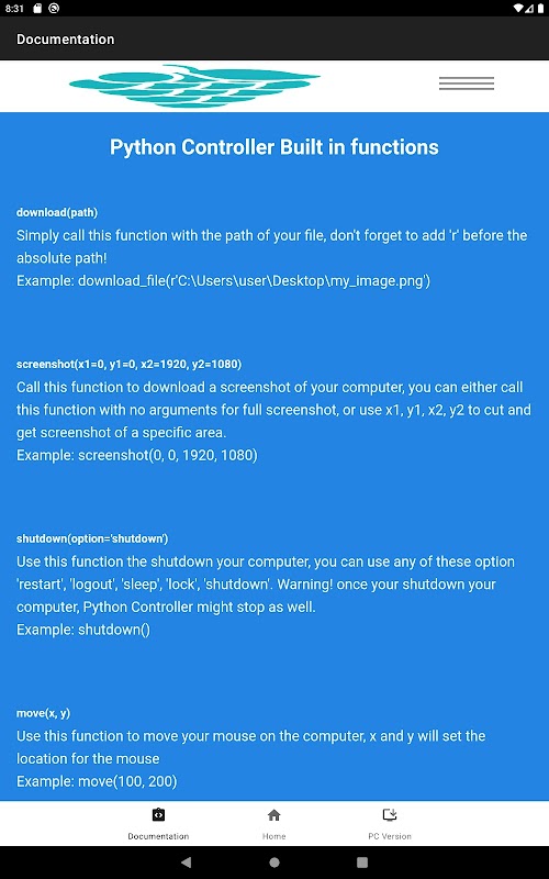 Python controller เป็นแอปพลิเคชั่นแรกที่ให้คุณส่งคำสั่ง python จากสมาร์ทโฟน แท็บเล็ต หรือคอมพิวเตอร์เครื่องอื่นไปยังคอมพิวเตอร์ที่บ้านของคุณ