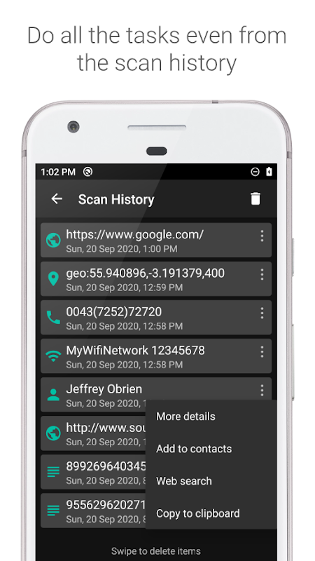 เครื่องอ่าน QR และบาร์โค้ดของเรายังเก็บประวัติการสแกนทั้งหมดของคุณซึ่งหมายความว่าคุณสามารถสแกนบาร์โค้ดหรือรหัส QR และค้นหาข้อมูลเพิ่มเติมเกี่ยวกับสิ่งเหล่านี้ได้ในภายหลัง ค่อนข้างสะดวกเมื่อคุณต้องการวิเคราะห์ผลิตภัณฑ์บางอย่าง