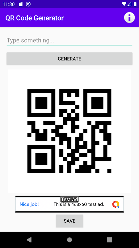 App allows you to generate QR code which can contain any text from ASCII table and then you can easily save it to your gallery.
