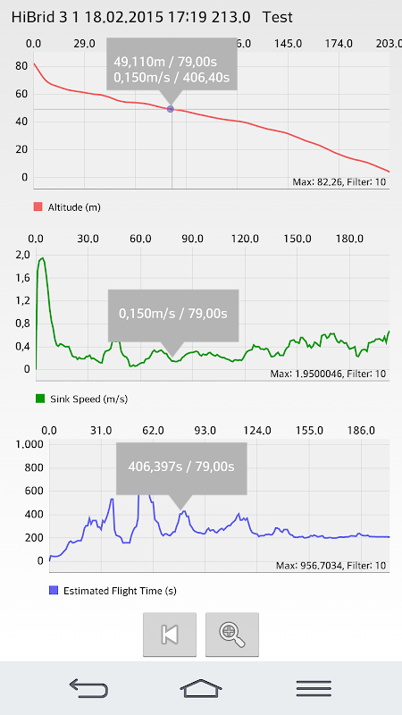The data are received by the app over a Bluetooth connection and are displayed immediately in a graph. The graphs can be edited by cutting away leading and trailing parts, setting a point in time to zero altitude, zooming in and out etc. A vertical hairline, which can be moved over the graph, allows display of relevant values in a pop-up box. The app includes a free definable moving averaging filter to make the altimeter graph more smooth and accurate. Also a time window for calculating the rate of descent can be set. Of course file management like saving, loading, deleting etc. is possible as is sending a dataset by email. This app requires telemetry hardware, which can send the data over a Bluetooth serial port (Bluetooth direct cable link) at 115200 Baud. The hardware should listen for the character “{“ and then stream the data over Bluetooth to the app. The data should meet the following protocol: