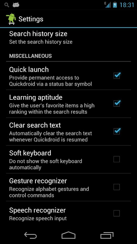 - Preference option to exit Quickdroid by pressing the back key once even if the soft keyboard is visible