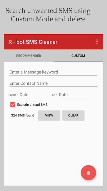Custom Mode provides a filter where User can select his own options to view and delete the SMS.