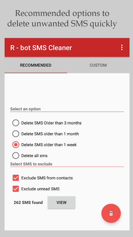 Recommended mode gives you quick way to delete unwanted SMS. It has option to exclude SMS from contacts and Unread SMS