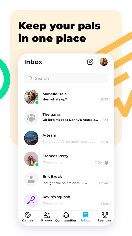 การค้นหาพันธมิตรด้านกีฬาในพื้นที่ของคุณไม่เคยง่ายอย่างนี้มาก่อน ด้วยคุณสมบัติการค้นหาของ RacketPal คุณสามารถค้นหาพันธมิตรกีฬาในระดับใกล้เคียงกับคุณได้อย่างรวดเร็วและง่ายดาย คุณสามารถค้นหาผู้เล่นเริ่มแชทและจัดการแข่งขันได้ในเวลาไม่กี่นาที