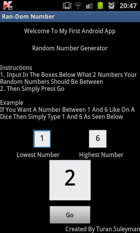 A Simple Small Random Number Generator. No Adverts. Doesn't Take Up Space. Doesn't Slow Your Device Down.