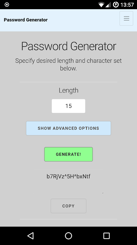 This generates random passwords within the app; passwords are neither requested nor transmitted externally from or to your device so your generated passwords are secure.