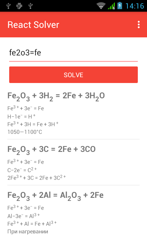 Приложение для быстрого решения химические реакций. Отличная помощь школьникам и студентам. Для поиска решений не надо учитывать коэффициенты.
