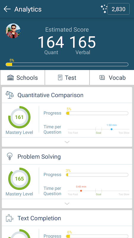→ Detailed analytics that show your mastery level, progress, and pace for each section of the test, helping you zero in on what you need to study