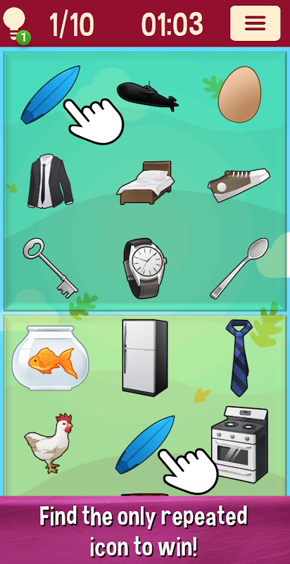 เป้าหมายของคุณนั้นง่ายมาก: ค้นหาวัตถุที่เหมือนกัน 1 ชิ้นเพื่อเคลียร์กระดานและไปยังรอบต่อไป มีวัตถุที่ซ้ำกันเพียง 1 ชิ้นต่อรอบ ดูเหมือนว่าจะหาเกมได้ง่าย แต่การจะหาเจออาจใช้เวลานาน
