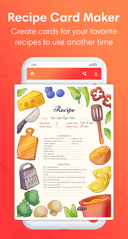 คุณสามารถสร้างการ์ดสูตรอาหารได้ทุกประเภท และบันทึกไว้ในแกลเลอรีบนมือถือเพื่อพิมพ์ได้