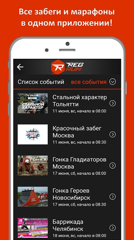 RegRun (РегРан) - это первый в России календарь забегов, марафонов и других любительских соревнований! Специально для Вас лучшие и актуальные спортивные мероприятия. Мы разработали простой и удобный интерфейс, чтобы Вы могли легко найти интересное событий, зарегистрироваться и участвовать с друзьями, с семьей или в одиночку! Ставьте перед собой новые цели и достигайте успеха! Получайте удовольствие и развивайтесь!