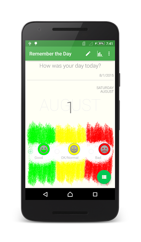 วันทั้งหมดถูกแบ่งออกเป็นสามประเภท (ดี, ตกลง/ปกติ, แย่) ซึ่งอธิบายอารมณ์หรือความรู้สึกของผู้ใช้คร่าวๆ ในแต่ละวัน ผู้ใช้สามารถเพิ่มบันทึกใหม่สำหรับวันปัจจุบัน ดูวันที่ระบุก่อนหน้านี้ เปลี่ยนปัจจุบัน บันทึกระหว่างวัน* และดูสถิติพื้นฐานเกี่ยวกับประเภทบันทึกย่อที่จัดเก็บไว้