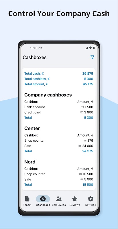 ตรวจสอบยอดคงเหลือของ Cashbox ทุกใบได้อย่างง่ายดาย ณ เวลาใดก็ได้ แท็บ Cashbox จะแสดงยอดคงเหลือปัจจุบันของ Cashbox ทั้งหมดที่สร้างในแอป RO พร้อมแสดงเงินสดทั้งหมดและจำนวนเงินที่ไม่ใช้เงินสด พร้อมผลรวม