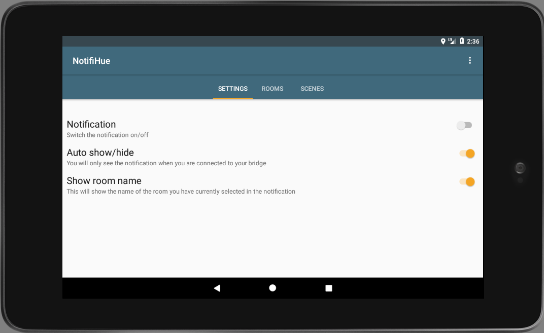 ด้วย Remotification: ฟิลิปเว้ง่ายยิ่งขึ้นในการดำเนินงานหลอดไฟ Philips เว้ของคุณ เชื่อมต่อแอปครั้งหนึ่งเคยเป็นสะพาน Philips เว้และห้องพักทุกห้องและฉากจะถูกนำในการควบคุมแจ้งเว้ นอกจากนี้ยังเป็นไปได้ที่จะสร้างกลุ่มของคุณเองและฉาก จากนั้นเลือกห้องพักและฉากที่คุณต้องการควบคุมจากการแจ้งเตือน ประกาศนี้จะหายไปเมื่อคุณไปออกจากบ้านและปรากฏขึ้นอีกครั้งเมื่อคุณได้รับบ้าน ห้องพักทุกห้องของฉากและการตั้งค่าจะซิงค์กับอุปกรณ์ทั้งหมดของคุณทั้งหมดที่คุณต้องทำคือการเข้าสู่ระบบดังกล่าวข้างต้นด้วยบัญชี Google เดียวกัน