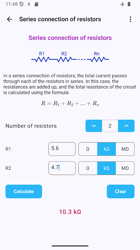 คุณยังสามารถคำนวณค่าความต้านทานรวมสำหรับการต่อแบบอนุกรมและขนาน รวมถึงการคำนวณตัวแบ่งแรงดันตัวต้านทาน ซึ่งทำให้แอปนี้เหมาะสำหรับการออกแบบวงจรและการคำนวณอย่างรวดเร็ว