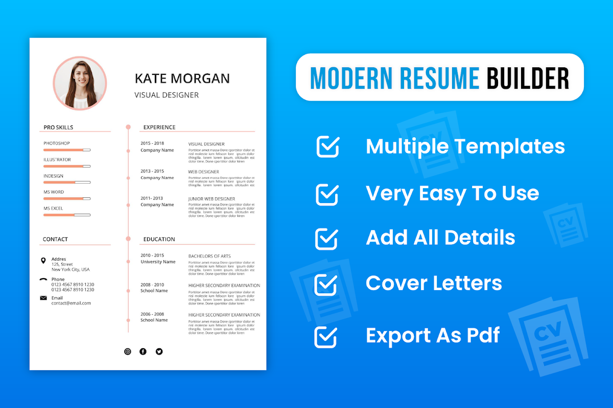 ขอแนะนำ 'Resume Builder - CV Maker App' โซลูชั่นขั้นสูงสุดสำหรับการสร้างเรซูเม่และ CV ระดับมืออาชีพได้อย่างง่ายดาย ไม่ว่าคุณจะเป็นมืออาชีพมากประสบการณ์หรือเข้าสู่ตลาดงานเป็นครั้งแรก แอปของเรามอบประสบการณ์ที่ราบรื่นเพื่อช่วยให้คุณโดดเด่น