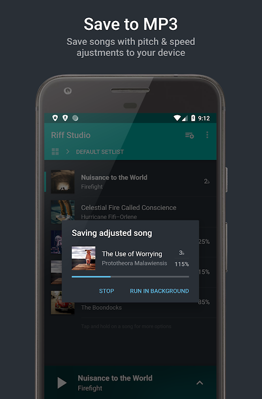 นอกเหนือจากประสบการณ์ในแอป Riff Studio ยังให้คุณบันทึกหรือส่งออกเพลงที่ปรับไปยังอุปกรณ์ของคุณในรูปแบบ MP3
