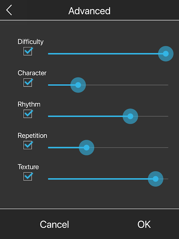 สร้างตัวละครของคุณโดยการปรับความยากตัวละครจังหวะการเล่นซ้ำและการเลื่อนพื้นผิว พารามิเตอร์แต่ละตัวช่วยให้คุณสามารถกำหนดรสนิยมของคุณได้