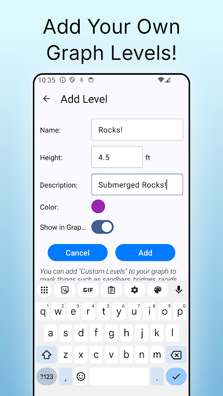 ปรับแต่งกราฟระดับน้ำของคุณด้วยเครื่องหมายระดับน้ำส่วนตัวสำหรับสะพาน สันทราย โขดหิน หรือระดับการเดินเรือที่ปลอดภัย เพิ่มสถานีวัดระดับน้ำที่คุณชื่นชอบเพื่อการตรวจสอบอย่างรวดเร็วได้ทุกเวลา