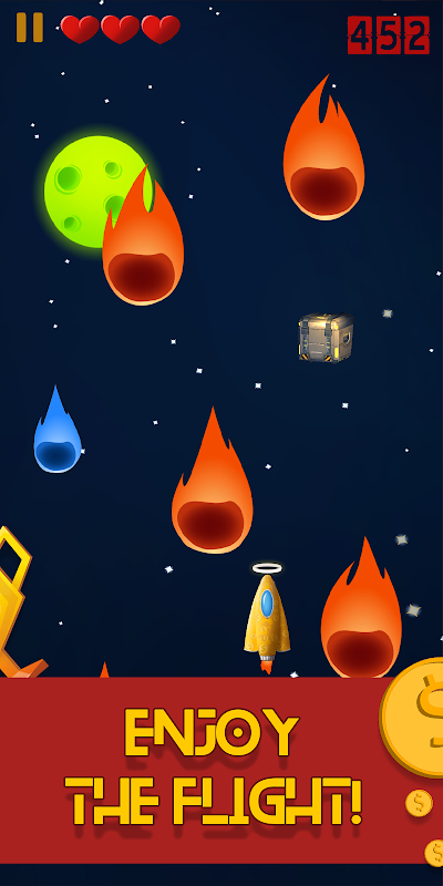 เกมอาเขต 2D ที่คุณคัดท้าย Starship ของคุณเองผ่านช่องว่าง กฎง่ายมาก คุณต้องหลีกเลี่ยงดาวเคราะห์น้อยและรวบรวม powerups และเหรียญไปพร้อมกัน เลือกวิธีของคุณเองในการพวงมาลัยเรือของคุณ: ชี้นักบินอัตโนมัติไปที่ไหนและเขาจะปฏิบัติตามคำสั่งของคุณหรือเลื่อนจรวดด้วยจอยสติ๊กหรือใช้ตัวเร่งความเร็วในตัว Powerups จะช่วยให้คุณสามารถปรับปรุงเรือของคุณได้ และสนามแรงอาจเป็นประโยชน์จริงๆออกมีเชื่อฉัน ด้วยอาวุธที่เก็บรวบรวมคุณสามารถทำลายอุปสรรคและเรือข้าศึกของคุณ