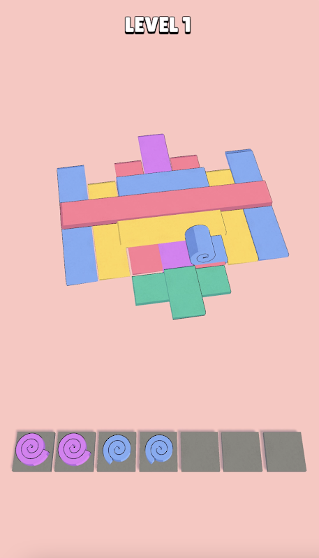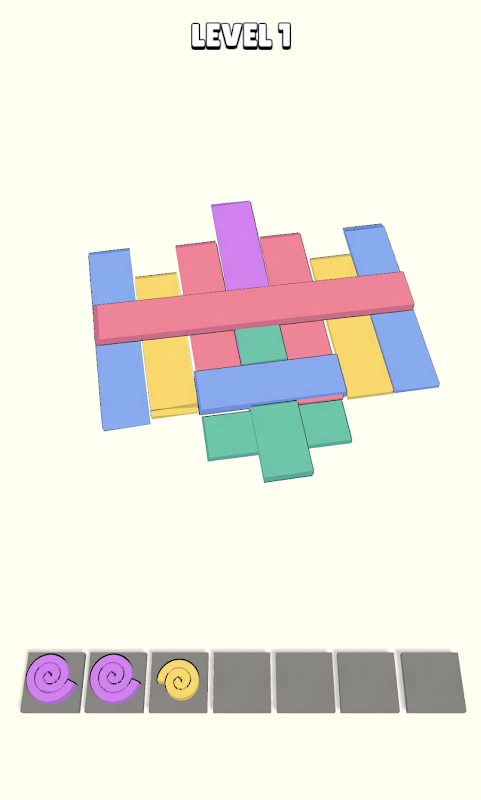 Player needs to roll up the tapes and match the 3 same colors to eliminate them. Be careful! They are covering each other!