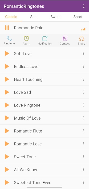 แอพริงโทนโรแมนติกเป็นคอลเลกชันฟรีของเพลงโรแมนติกยอดนิยมและเพลงเป็นริงโทนรักที่ไม่ซ้ำใครซึ่งคุณสามารถใช้เป็นเสียงเรียกเข้า การแจ้งเตือน การปลุก หรือกำหนดให้กับผู้ติดต่อและอีกมากมาย
