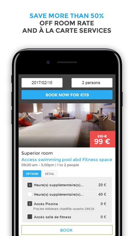 RoomForday is the hotel booking platform dedicated exclusively to daytime customers (day use). Through our smart, userfriendly booking platform and apps, customers have access to daytime hotel rooms and suites, meeting rooms, spas, fitness studios, swimming pools, restaurants... all the extra facilities and services hotels can offer, now in over 500 select 3 to 5 star hotels. Designed like a guide, it proposes various search options by area or city and by interest or theme.