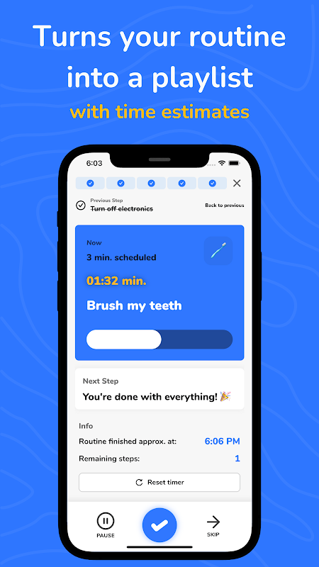 สร้างกิจวัตรประจำวันพร้อมตัวจับเวลาสำหรับแต่ละงาน เข้าสู่สถานะการไหลหรือไฮเปอร์โฟกัส ADHD อย่างรวดเร็ว และเข้าไปในโซนในขณะที่ทำกิจวัตรตอนเช้าของคุณให้เสร็จ หากคุณกำลังทำการบำบัดพฤติกรรมทางปัญญา (CBT) RoutineFlow จะมีประโยชน์ในการสร้างกิจวัตรง่ายๆ