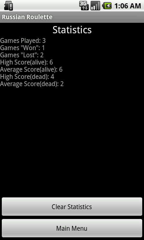 A seriously simple game "simulating" Russian Roulette. Each round, pick a number between 1 and 6, and hope that it isn't the number of the chamber with the bullet, or it's game over.