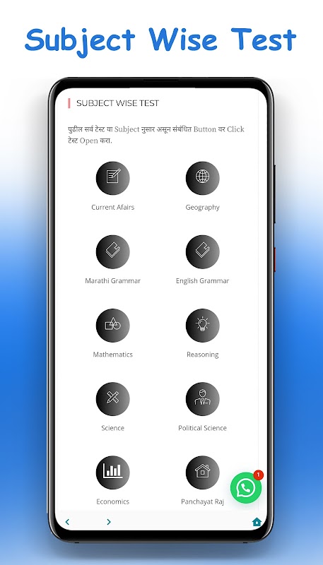 Subject's Wise Daily Online Test : चालू घडामोडी, मराठी व्याकरण, इंग्रजी व्याकरण, भूगोल, इतिहास, अर्थशास्त्र, राज्शास्त्र, विज्ञान, गणित, बुद्धिमत्ता, पंचायत राज या सर्व विषयांच्या टेस्ट ॲप वर देण्यात येतात.